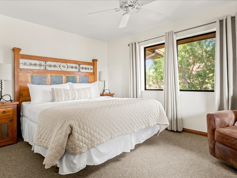 This spacious studio room, situated in the main building, features a luxurious king-size bed and a generously sized living area that opens onto a balcony. Additionally, guests can enjoy the communal living and dining areas, as well as access to patios offering breathtaking views of the iconic red rocks.